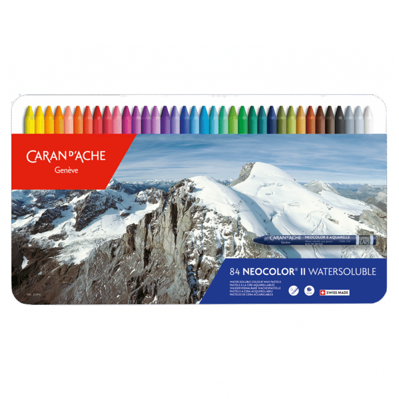 Metallboks fra Caran D’Ache med 84 vannoppløselige voksoljepasteller.