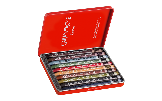 Neocolor II Aquarelle fra Caran d’Ache er profesjonelle vannoppløselige voks-pasteller kjent for intens farge, myk tekstur og allsidig bruk. De kan brukes både tørt og med vann for å skape alt fra klare linjer til akvarelleffekter.