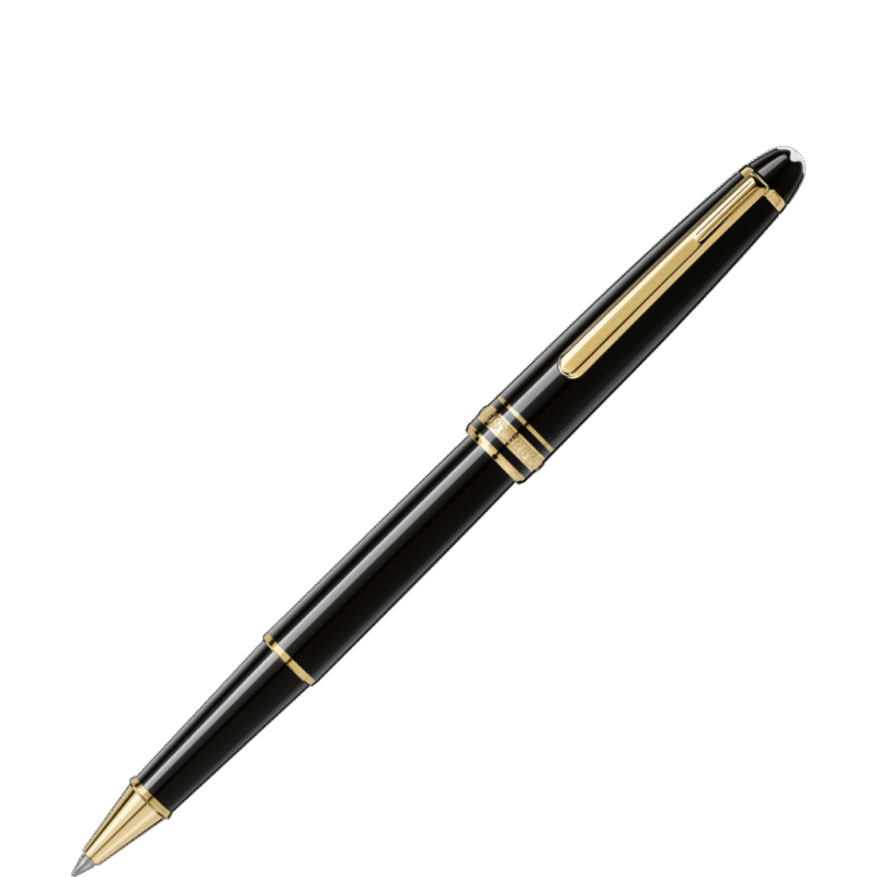 Meisterstück Classique i dyp sort precious resin med gullbelagte detaljer, toppet med det hvite stjerneemblemet. Tre gullbelagte ringer langs pennekroppen med Montblanc skrift og en gullbelagt klips med individuelt serienummer.