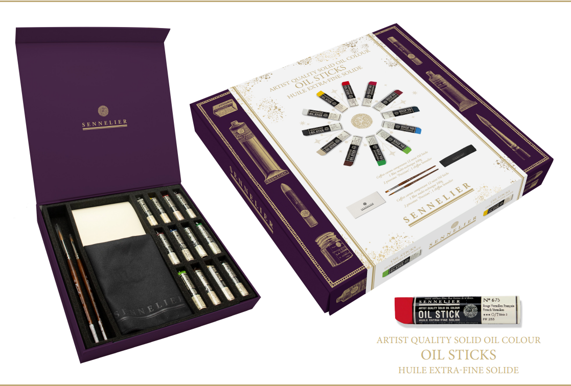 Dette eksklusive settet fra Sennelier kombinerer det beste fra oljemaling og pastell i praktisk stick-form. Settet inneholder 12 mini Oil Sticks, 1 blokk “Oil Painting Paper Pad” (240 g), 1 “Precision” pensel, 1 malekniv og 1 Sennelier-klut.
